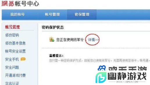 2、接着在密保页面,点击将军令旁边的详情按钮;