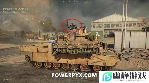 到达第一个掩体内的**后需要进入一辆坦克。驾驶坦克向下一个目标推进。在道路尽头向右转弯之前,可以看到一架敌方直升机在投放增援部队,用坦克射击直升机并将其摧毁即可解锁奖杯。注意此部分只有两架投放增援部队的直升机,所以如果错过了这一架,最好重启检查点再试。