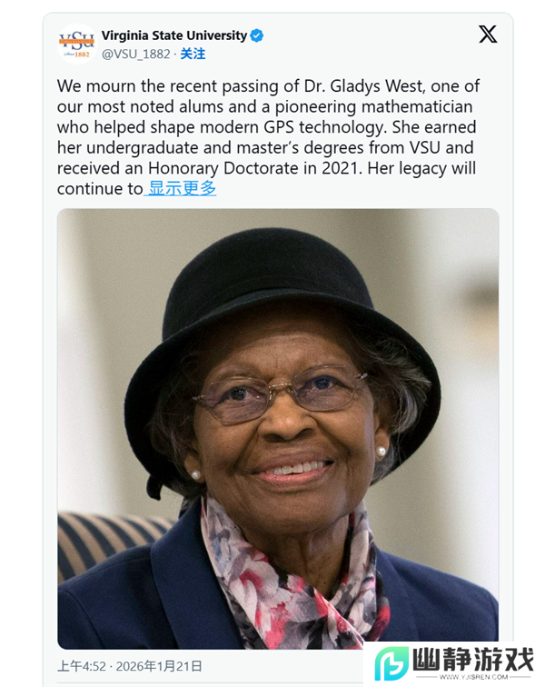 1月22日消息,“GPS之母”、美国数学家韦斯特(Gladys West)17日在家人陪伴中过世,享年95岁。